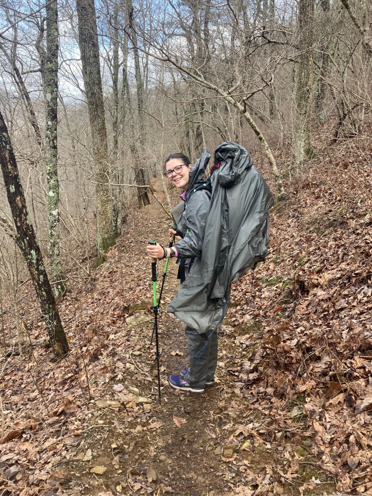 That night, the rain came, real rain, all night. My tent held up pretty well. Sophie was less lucky, and her sleeping bag and other gear got wet. We blame the slanted tent site. Despite the slant and the rain, I had my best night of sleep on trail so far. We stayed in our tents for a long time that morning, waiting out the rain that stopped around 9:30. While we were still there, we decided to get off trail for Sunday, which would be a cold, rainy day. Sophie booked us two nights in a hostel that was a little ways up the trail. This turned out to be a great idea, since later on the hostel filled up quickly! With this plan in the works, we knew we didn’t have to go very far over the next two days, so we continued our lazy morning and didn’t clear out of camp until after 11am. I felt a little antsy to be the last ones at the shelter, but we reminded ourselves to Hike Our Own Hike and stick to our plan. It was pretty filthy to take down our tents. I didn’t realize how heavy the rain fly got when it’s all wet! I strapped my rainfly to the back of my pack, where it kept Ninja company. Sophie did the same with her tent, and it flapped around her like a cape all day. We hoped they would dry out as we hiked and the sun came out.