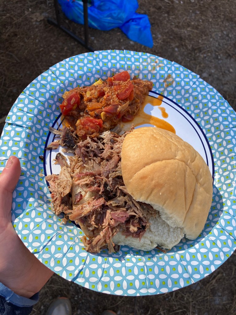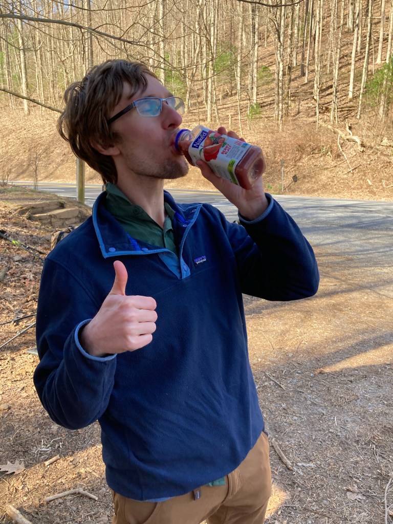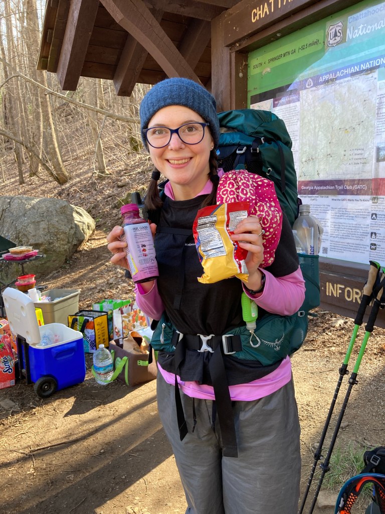 We only had five miles to go that day, though it was not trivial terrain. First we summitted Blue Mountain, then descended into Unicoi Gap, where we were met with a double dose of trail magic!! It was unbelievable. Considering this was our only major stop on our way, and knowing it was a relatively major gap, I had been thinking how cool it would be to get trail magic even on a short day, but it was more than I ever could have hoped for. We are so spoiled!! It was such a wonderful double spread of food. Naked juice was a very special treat, and we had homemade barbecue at 10 in the morning, including something called Brunswick stew which was truly delicious. Can’t say enough about the generosity of the trail angels down here.