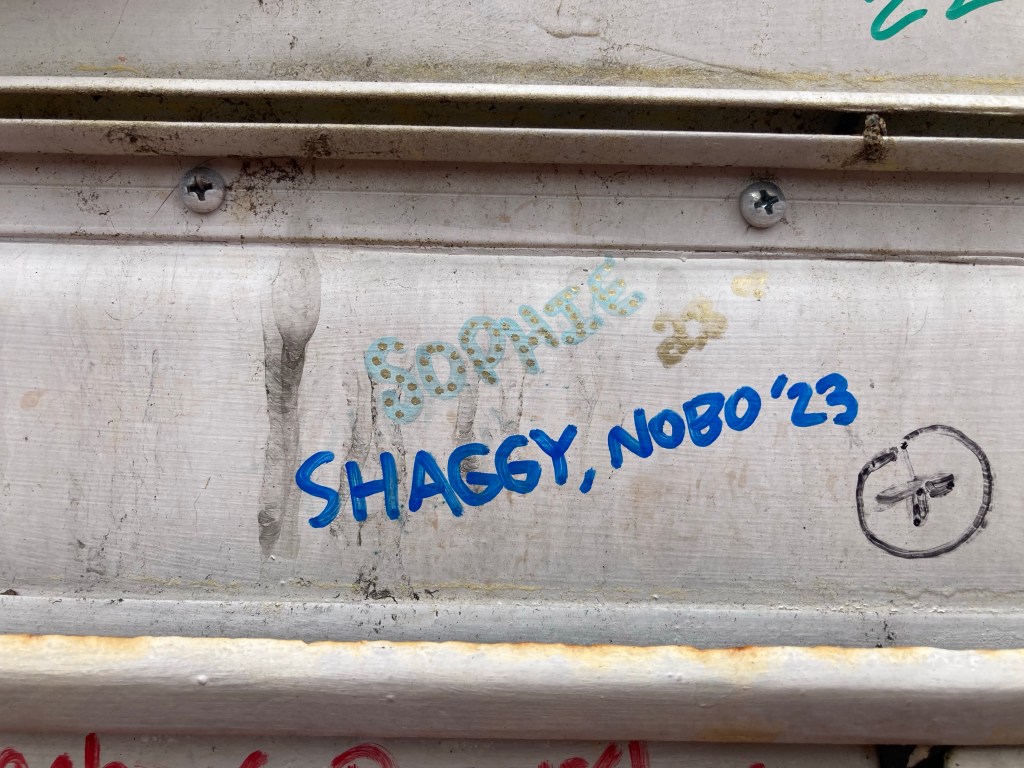 We started hiking in a deep fog; it was a cool change of pace. As soon as we came up out of the valley, though, the fog swept away; it was magical how quickly it happened! Once we were hiking, it ended up being a pretty easy day. Sophie taught me “the Got It game,” and we discussed playing the “license plate game,” sort of, except with where hikers we meet are from. To my great surprise, we have yet to meet anyone else from New England, or any Californians! The sun came out and it warmed up, although it was very windy! We learned our lesson about eating lunch up on a ridge in the wind. We arrived at Blue Mountain Shelter at around 3pm. Overall, it was a healing day in several respects. My hip felt fine after a night of sleep, and wearing my pack higher helped. Ninja was hanging in there too, although his head had deflated significantly. I knew that would happen, but it still happened faster than I expected, probably due to the elevation. He just had five more miles the next day to get into town and complete his section hike! Our gear (especially Sophie’s tent) had dried a bit on the hike, and when we got to the shelter we joined others in putting up a clothesline to finish drying our stuff. Just had to make sure to tie it down, because it was super windy up there!