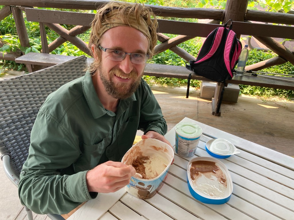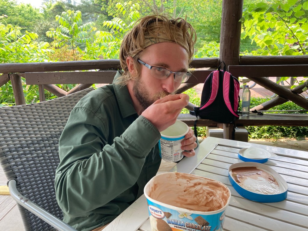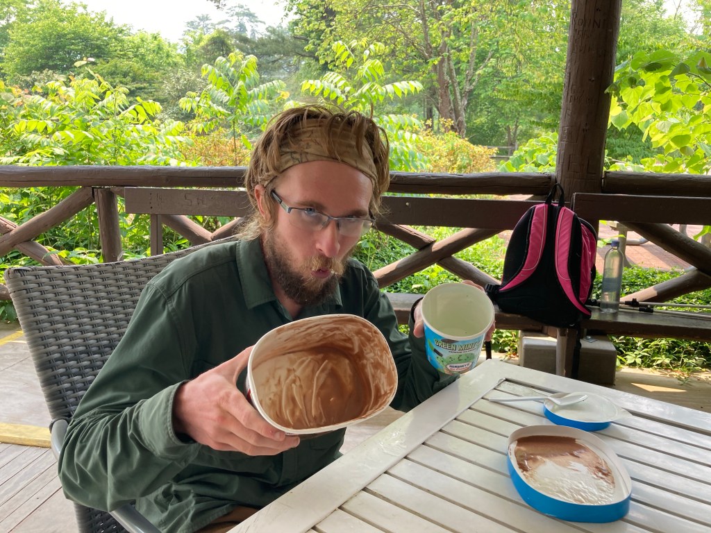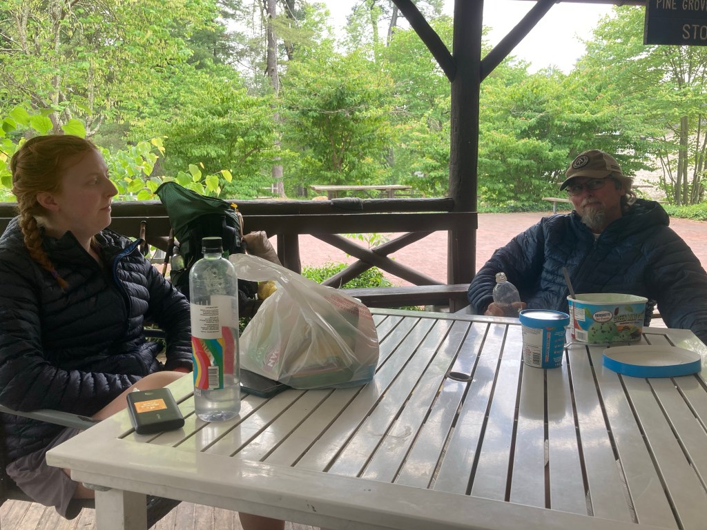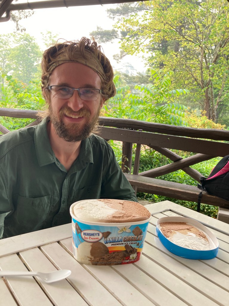 I had essentially set aside the whole day for this, thinking that I wouldn’t be in much of a state to hike after the ice cream. But I found myself ready to hike on surprisingly soon, after I digested a bit. Before I could go, though, Cookie arrived, who I hadn’t seen since Damascus! I was the only other hiker there at that point, so I stayed to cheer her on while she took on the half gallon challenge. It was cool to see her again and connect with her. Eventually, Dutch, Heimlich, and Yoga all arrived to do the challenge as well! It was a great time hanging out with them all.