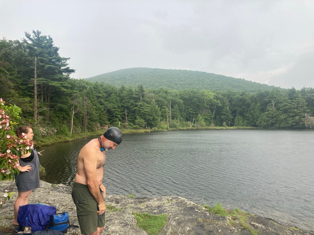 It finally rained lightly as I came down Mt. Everett, which was too bad, since I had been hoping to swim in pretty Guilder Pond. The poor swimming weather didn’t stop a local getting his laps in, though.