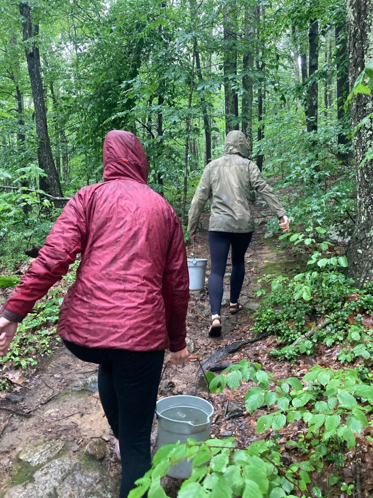 So I didn’t. As the Sun God reminded me, “There are no points for suffering.” Instead, I hung around for a couple hours in the morning. I had chocolate chip pancakes (the chocolate chips were a nice surprise) for breakfast and had a great time chatting with the Sun God and new friends Stakes and Oats. We also helped out by bringing buckets of lake water to the cabin. It felt like we were in the Sorcerer’s Apprentice.