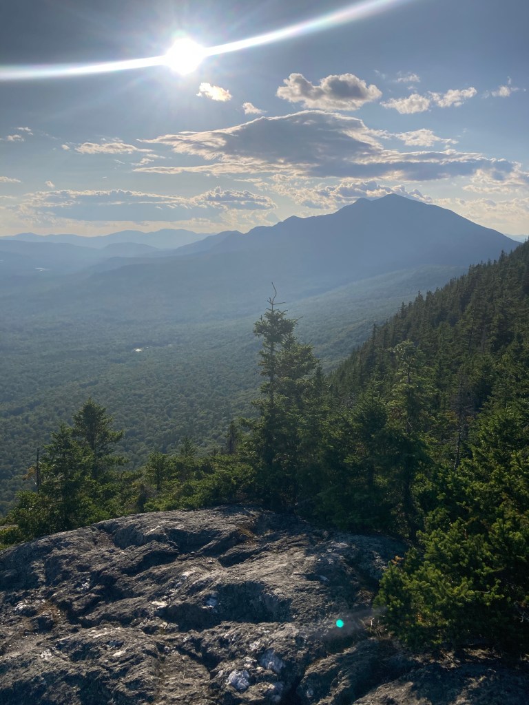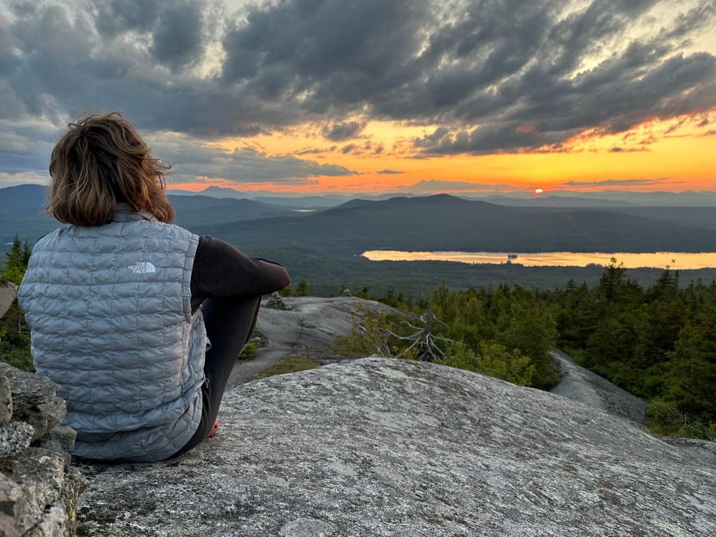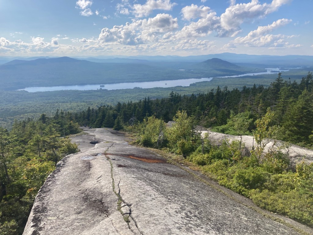 It was a gorgeous afternoon, with clear skies in the forecast for that night, and I had an inkling to cowboy camp again. Yes, my first experience cowboy camping hadn’t exactly gone great, but I had heard that Moxie Bald Mountain was a great spot for it, and I was willing to test my luck again. Moxie Bald was a relatively small but much-beloved mountain, and when I ended my day there, I could immediately see why. It had an awesome, rocky, exposed summit with wonderful views in all directions, including the upcoming mountains of the Hundred Mile Wilderness and the High Peaks behind us. In particular, the distinctive peaks of the Bigelows in the distance made an awesome backdrop for a great sunset into the mountains.