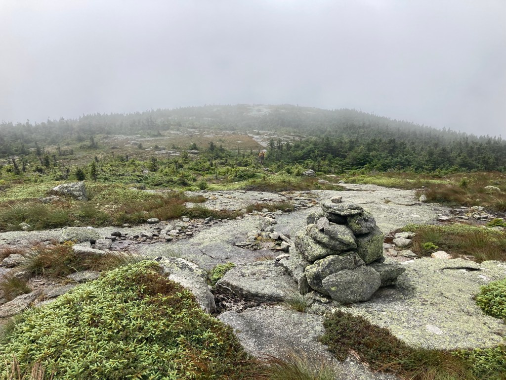 As it turned out, the “herd path” was incredibly easy to follow. Not only had so many people trod the path that it was very clear where the trail was, but it was often marked with ribbons on trees along the way. There was only one time on the return trip that we had a question about where to go, but quickly figured it out. After 1.2 miles (another quite long side trip – it would have been my longest side trail had it not been for Mt. Abraham the day before) we reached the summit of Mt. Redington. It was by far my most peak-baggiest peak yet! It was a wooded summit with no views, but that goes without saying. It was really fun to be able to have that unique experience with Bri, and I enjoyed getting to know her and Kinsman along the way.
