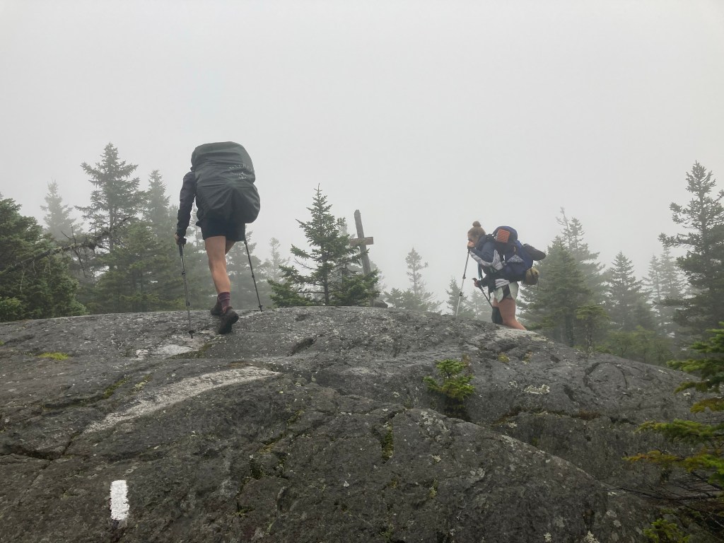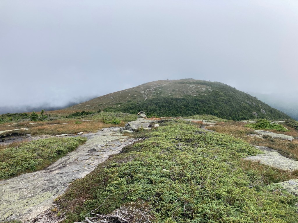 The climb up Saddleback featured classic Maine terrain of smooth rock with low-lying alpine vegetation all around us. It was not too difficult as we ascended to the summit in the fog. We did manage to catch some views through and under the cloud ceiling, though.
