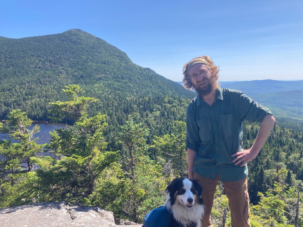 I was still standing there on the summit when a woman and her dog appeared, asking me about the herd path to Mt. Redington. Immediately, I forgot all about my day of silence and enthusiastically answered her. Since I wouldn’t be alone, I felt a lot better about navigating our way to Mt. Redington, and we decided to head there together. My new friend was another peakbagger named Bri, who was in the area to hike many of the 4kers in the High Peaks region. Her dog was named Kinsman!