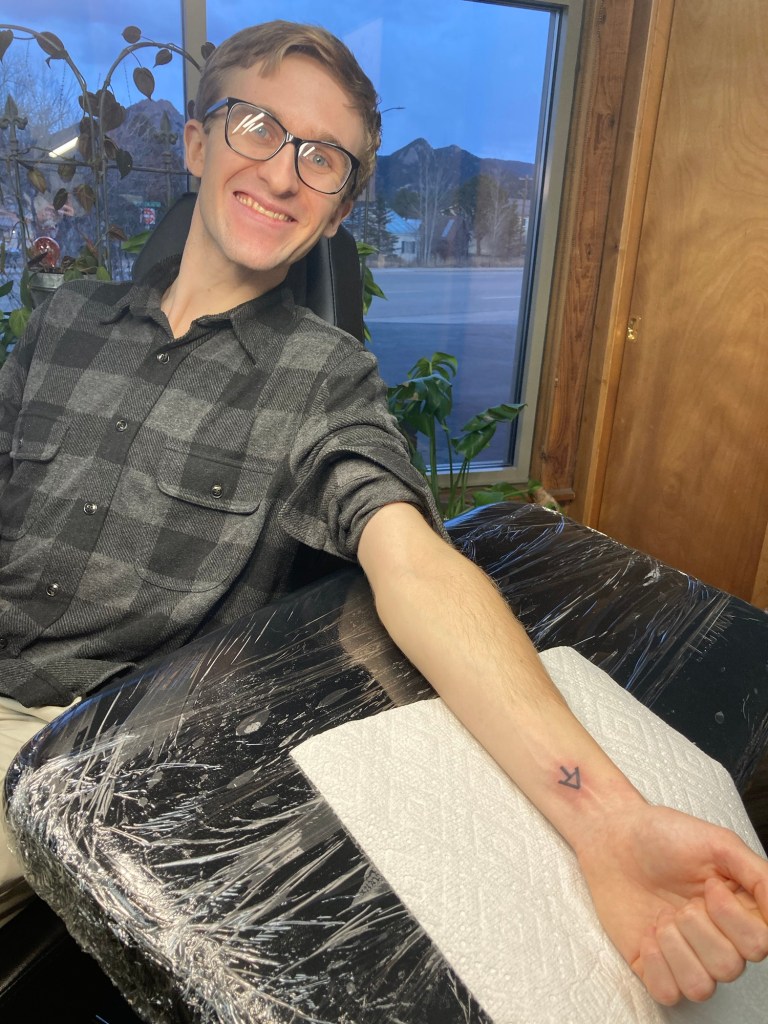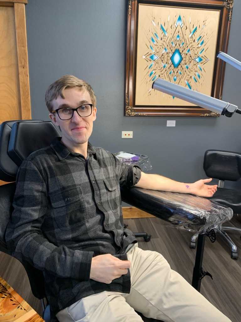 I finally went for it in Colorado over Christmas. I was definitely a little nervous; I didn’t have any qualms per se, mentally or physically, but it was hard to believe I was doing this! 15-year-old me would be quaking in his sneakers. I didn’t make an appointment, but decided to try my luck as a walk-in at a tattoo studio in Estes Park. The instant – the INSTANT – we met the tattoo artist, Cammie, and I showed her the AT symbol I wanted, she was absolutely ecstatic. It turned out, she was a prolific hiker herself, and had thru-hiked the Colorado Trail! She said that it was an honor to finally get to do a trail tattoo for someone. I was really glad to have that connection. Right from that moment, Cammie made it a positive and comfortable experience.