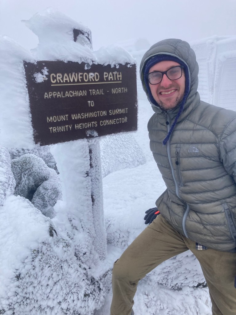 Fittingly, it was also around then that I finally made my true return to the AT. I had managed to squeeze in several more hikes throughout the winter; winter hiking is always a really nice change of pace, and I was glad to do more winter hikes than usual this year after spending so much time on the trail last summer. In mid-March (still very much winter in the Whites!), while Daniel/Scrappy was visiting, we hiked Mts. Jackson and Pierce in the Southern Presidentials on a cold, windy day. It was a real treat to introduce Daniel to the Presi and some of my favorite mountains anywhere. And it was also a treat to retread those miles between the peaks, the first miles I had hiked on the AT since Katahdin. I saw where Nom Nom and I had carefully crossed the deepest mud pit ever – a lot less scary when it was frozen over and covered in snow. I stopped by Mizpah Spring Hut where we had had our most excellent Hut Day 🙂 I even got stunning views from Mt. Pierce this time around! I found a white blaze in the camouflage of the snow :’) It was so special to return to the trail. It was a reminder that my AT journey need not – and did not – end on Katahdin.